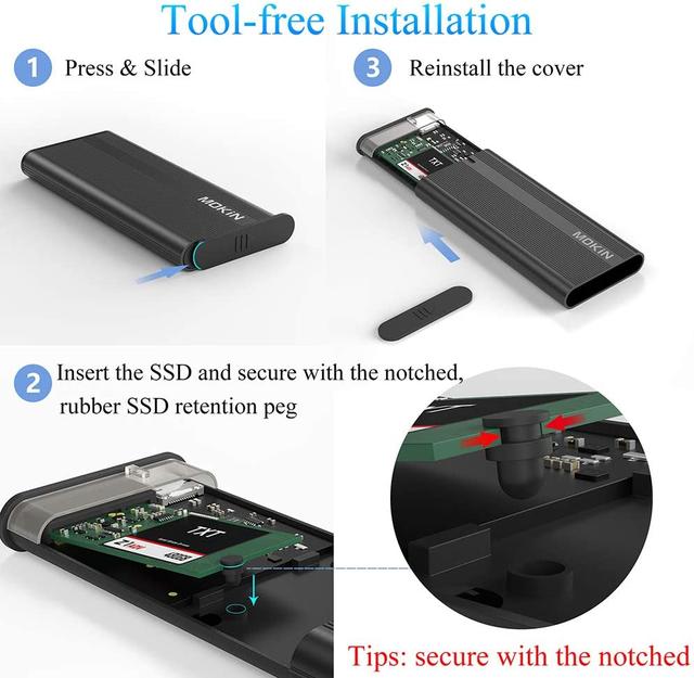 Корпус NVMe, що не вимагає використання, дає змогу швидко та легко встановити твердотільні накопичувачі M.2 NMVe. Під час першого використання твердотільного накопичувача SSD m.2 необхідно відформатувати диск. Це буде безпечно для даних вашої пам'яті.