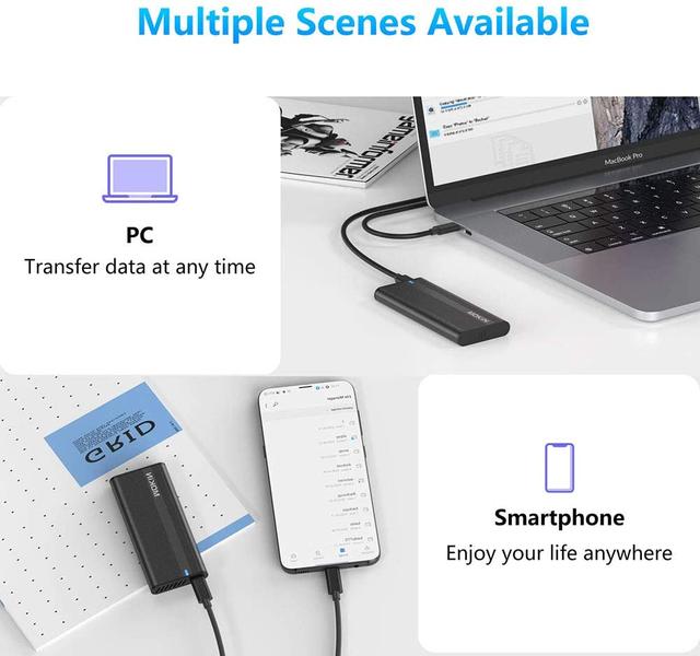 Корпус M.2 До 10 Гбіт/з Висока швидкість M.2 NVME на USB 3.1, ідеальне рішення для передавання та резервного копіювання даних, фактична швидкість передавання залежить від швидкості вашого SSD, типу USB-порту, продуктивності вашого комп'ютера, використовується носій NVMe тощо. Передавання одного фільму у форматі HD займає всього 2 секунди.