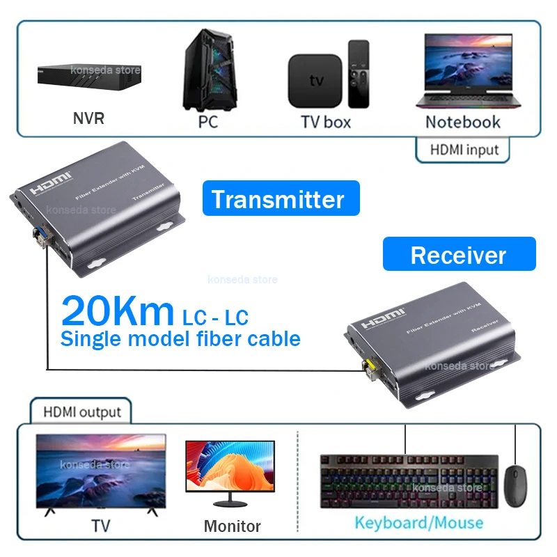 HDMI KVM подовжувач 20 км через оптоволоконний кабель LC 1080P USB керування трансівер відео миші клавіатури