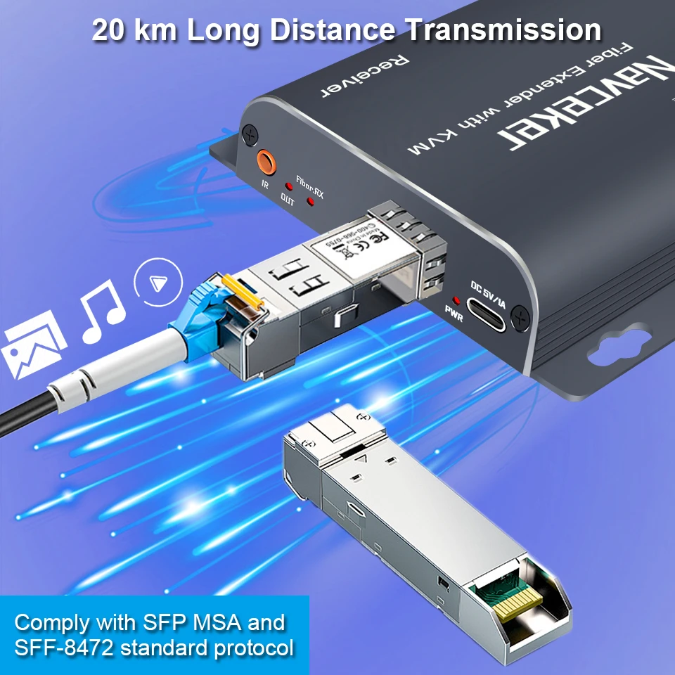 Navceker 20 км HDMI оптоволоконний USB KVM подовжувач відеопередавач приймач через LC подовжувач оптоволоконного кабелю KVM-перемикач для миші клавіатура ПК