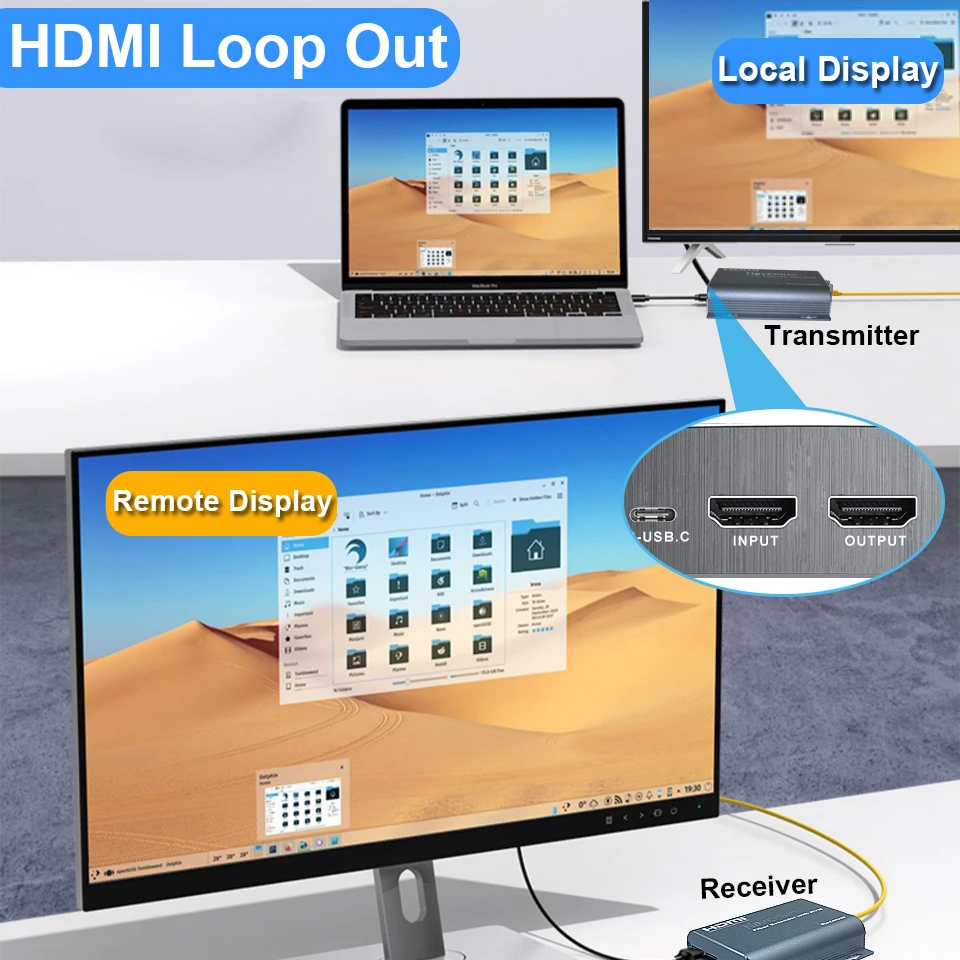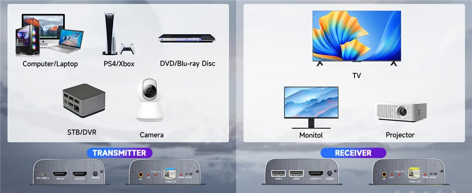 Приймач (RX) виконує зворотне перетворення. Завдяки використанню одномодового волокна та високоякісних оптичних модулів LC досягається стабільне передавання сигналу на відстань до 20 кілометрів за роздільної здатності 1080p@60Hz.